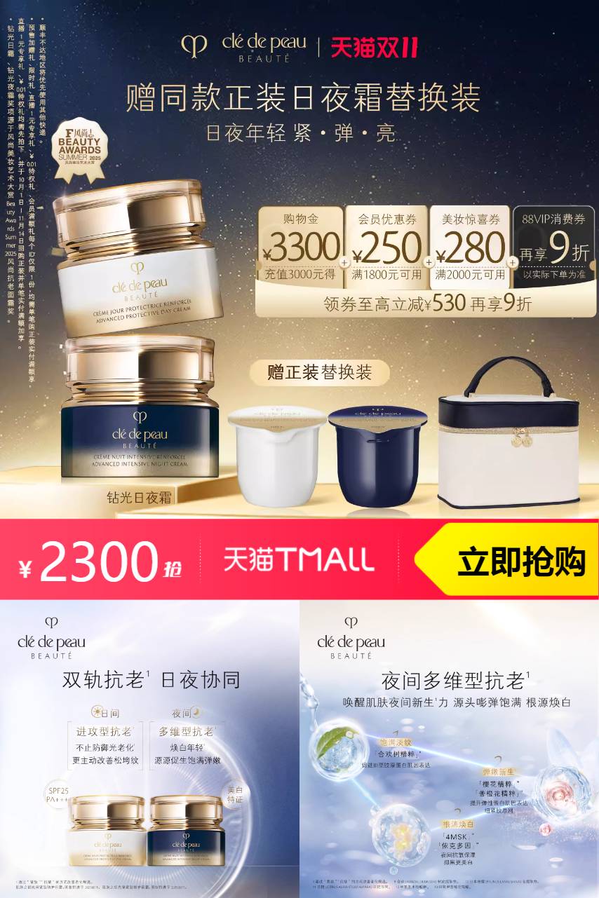 【赠: 日霜夜霜正装替换装 会员充3000抵3300 会员券满1800-250 可用美妆惊喜券2000-280 88vip消费券可享9折券】含有珍贵的护肤成分,如XX提取物和XX肽等,这些都是被证实能够显著改善肌肤状态的有效成分。使用后,你的肌肤会像钻石般闪耀,光彩照人。