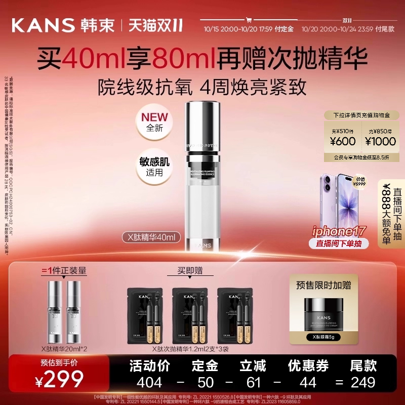 推荐:【抢!预售加赠】韩束X肽精华提亮美白紧致抗皱淡纹精华液