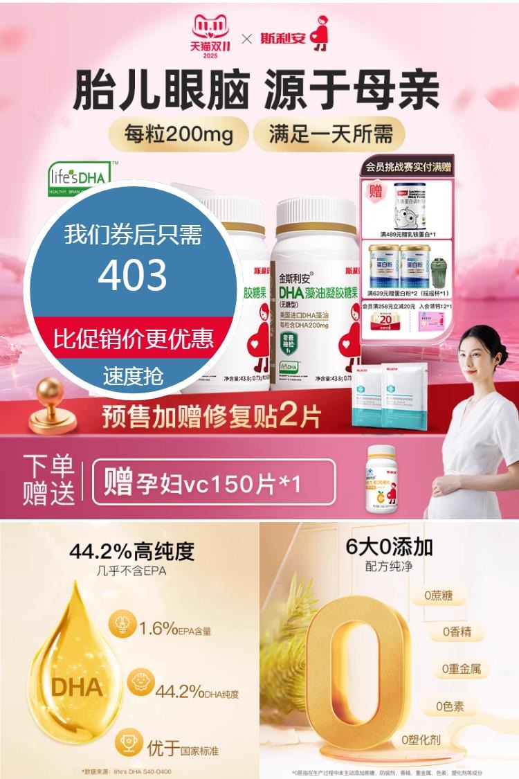 【预售付定50加赠修复贴*2+VC150片,88VIP+淘金币+消费券】斯利安孕妇dha藻油,每粒200mg满足一天所需,1人吃2人补,精纯6大无添加,从孕期吃到哺乳期,DHA“藻”补充,为眼脑加油!