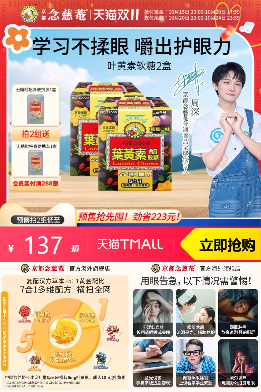 【官方立减15%,9折消费券,到手123.55】17日3天 七组 高金凯 638339845089 京都念慈庵叶黄素软糖2瓶 ,复配汉方草本+5:1黄金配比,7合1多维配方 横扫全网~