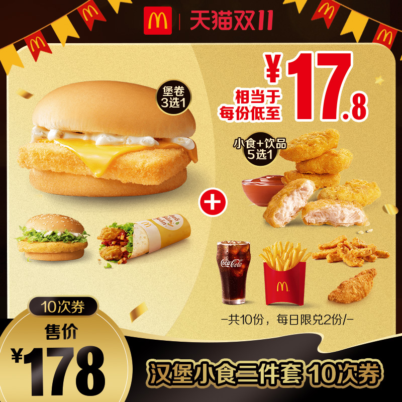 10次券超划算,汉堡+小食随心搭,麦当劳经典组合。