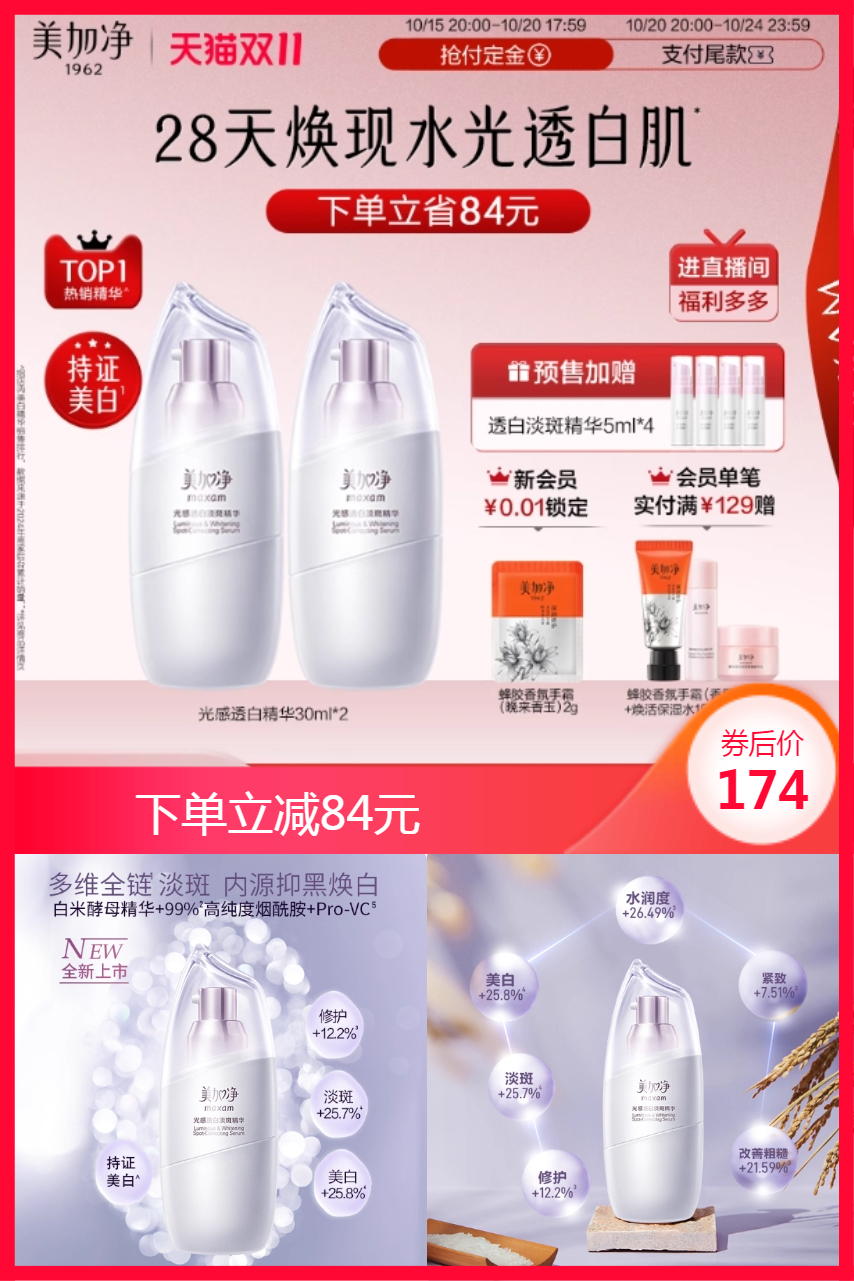 美加净 美加净美白精华淡斑烟酰胺透白30ml*2瓶 11元减39 商品纠错