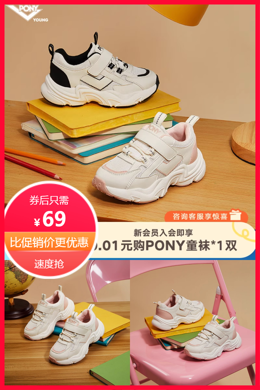 Pony儿童复古老爹鞋潮酷登场!轻盈透气设计,舒适缓震,孩子跑跳更自在~时尚小白鞋百搭耐穿,男女童款全都有,限时抢购超值入手!
