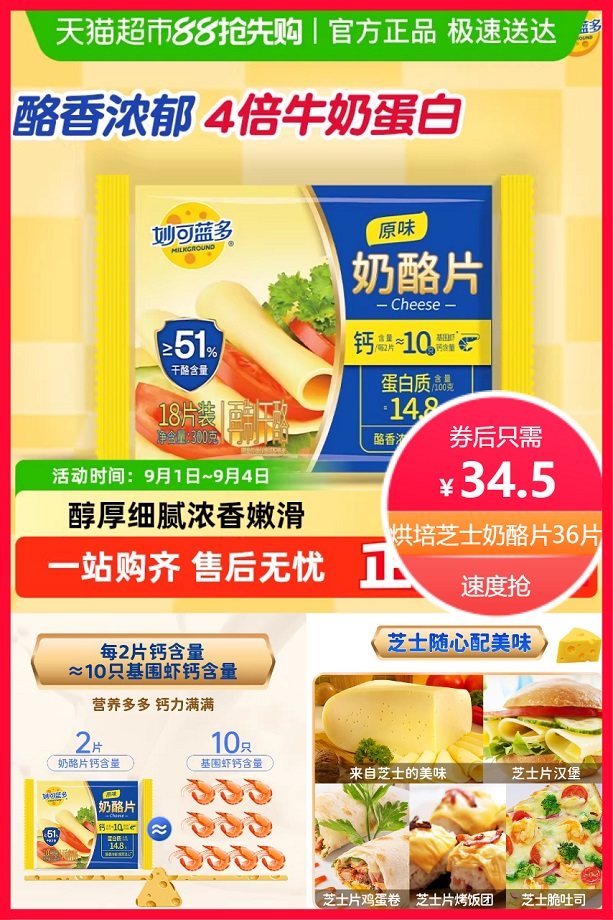 拍2件,个选项,券3元+直降40.8元+88VIP省1.8元+点击右上角淘金币省1.5元后约32.7元,妙可蓝多芝士片奶酪片烘焙芝士300g*2袋,三明治泡面披萨原味cheese,超赞!