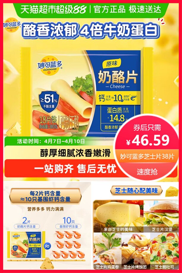 拍2件,个选项,券3元+官方立减19元+88VIP省2.4元+点击右上角淘金币省1.41元后约44.19元,叠加消费券200-25后约38.6元,妙可蓝多芝士片奶酪片烘焙芝士300g*2袋,三明治泡面披萨原味cheese,超赞!