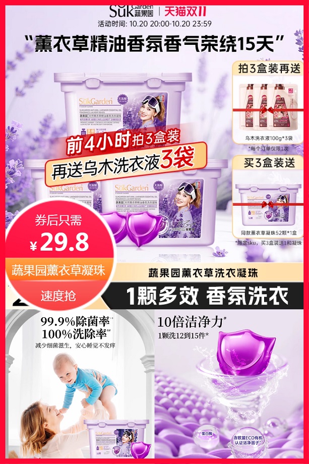前4小时拍3盒装送乌木洗衣液100g*3袋,拍3盒装送乌木洗衣液100g*3袋,官方立减18.08元+1件9.6折省3.24元+券30元+下拉淘金币抵扣3.83元后约25.97元,单颗只需0.2元一颗,蔬果园薰衣草洗衣凝珠,凝萃精油,舒缓情绪,1颗多效,除菌除螨,持久留香!