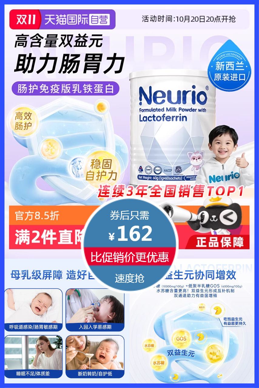 立减45元,直降73元,88会员淘金币天降包消费券叠加劵约135.5元!纽瑞优乳铁蛋白粉进口白金版60g,高含量双益元助力肠胃力,每100g含免疫球蛋白lgG6000mg,高纯乳铁蛋白纯度>97%,进口奶源,婴幼级安全可溯源,全龄适配,孕幼中老精准需求