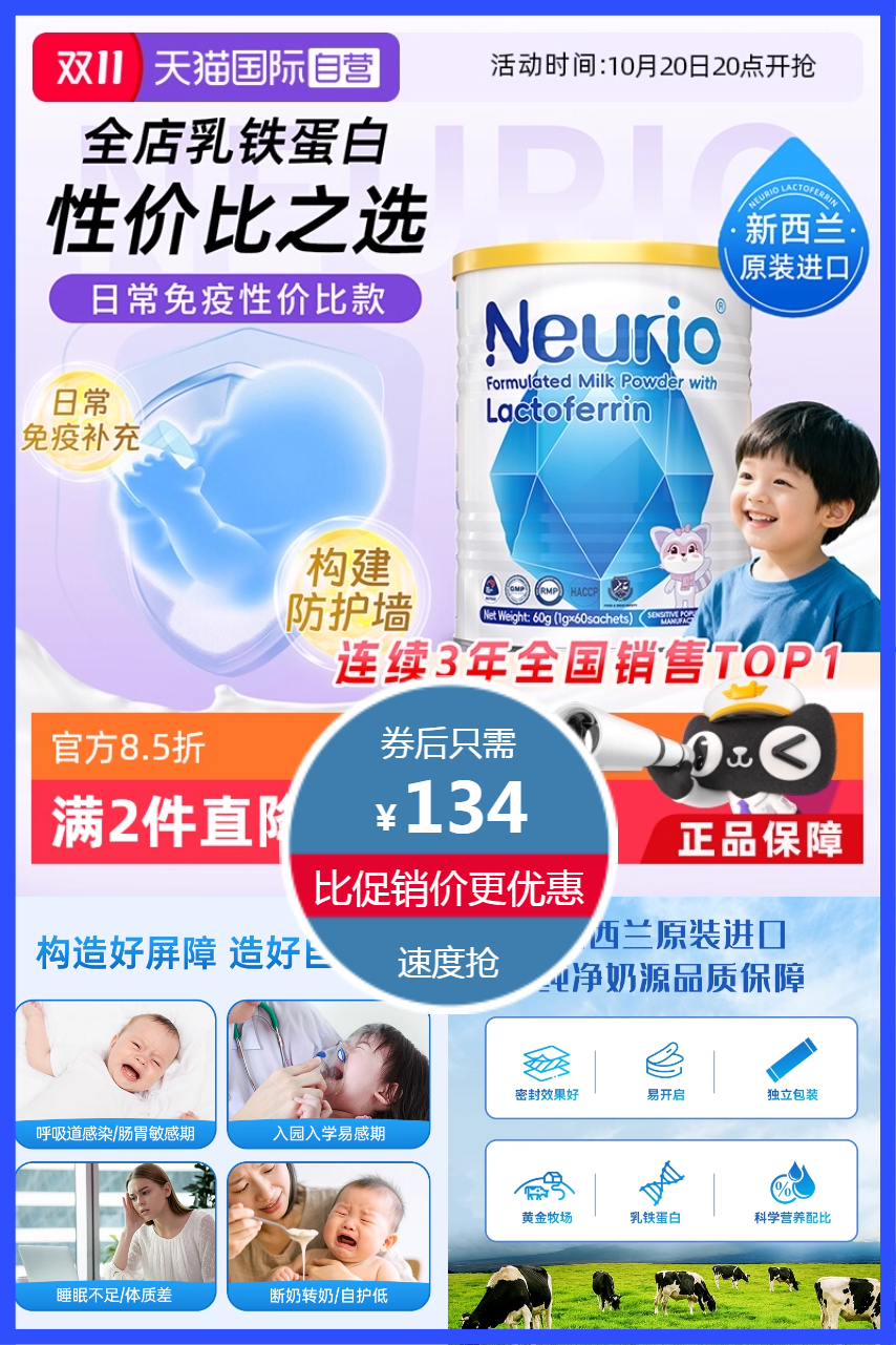 立减45元,直降106元,88会员淘金币9折消费券叠加劵约111.52元!纽瑞优儿童蓝钻版进口乳铁蛋白粉60g,新西兰原装进口,优质配方,科学配比,纯度>97%乳铁蛋白,完全活性乳铁蛋白,双效助力,强化自护力