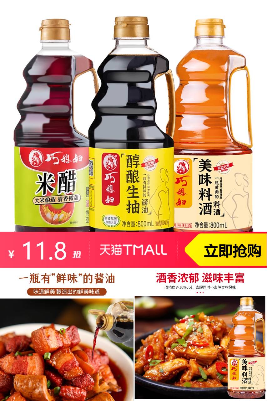 【淘宝秒杀直降直接到手,叠加消费券到手10.59到手三瓶 ,史D】巧媳妇醇酿生抽米醋料酒800ml*3,生抽+米醋+料酒三件套,炖卤更鲜香。