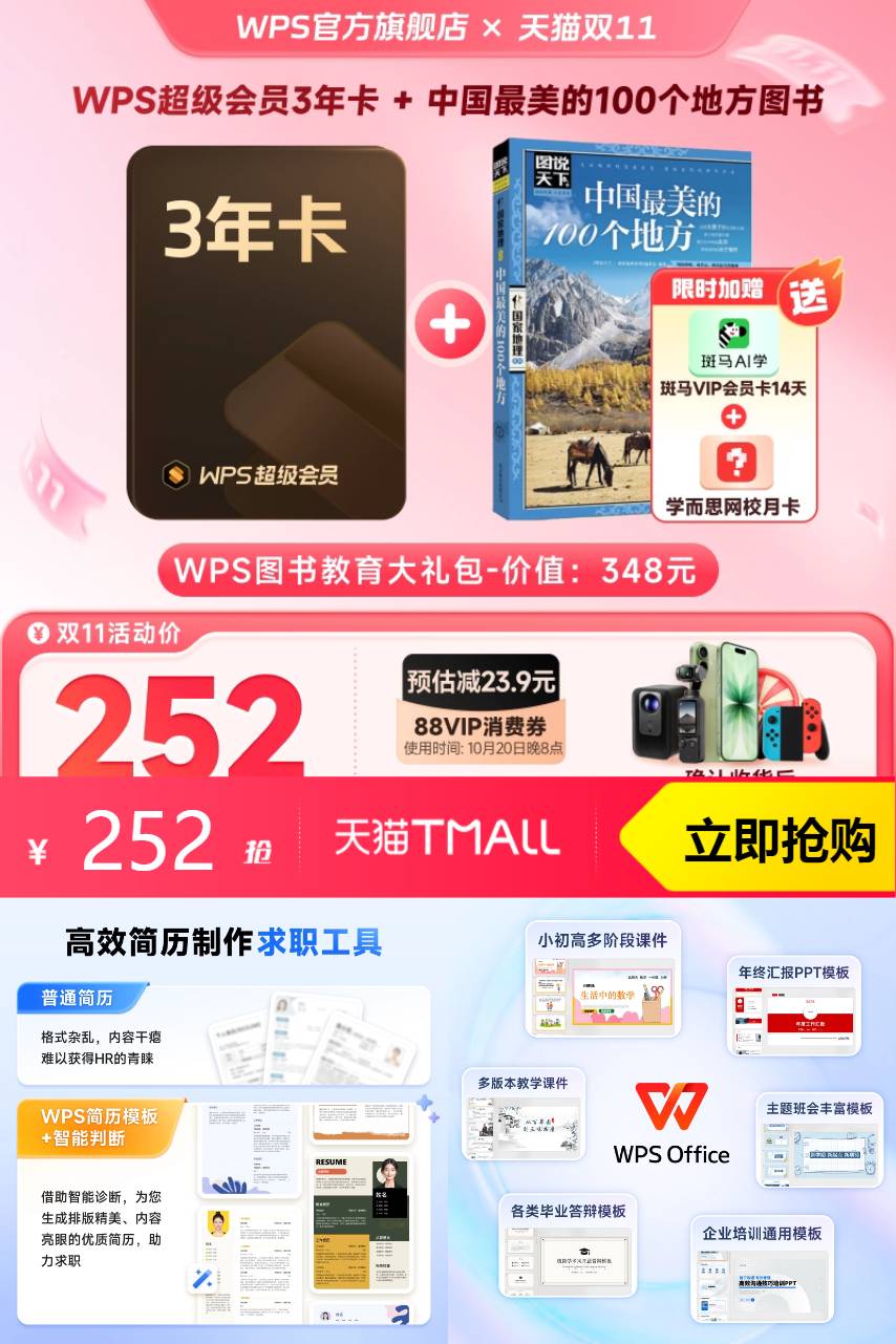 【叠加金币5.98,88vip 抵扣12.6,消费券后 到手210】会员+图书双重大礼包,办公学习全搞定。
