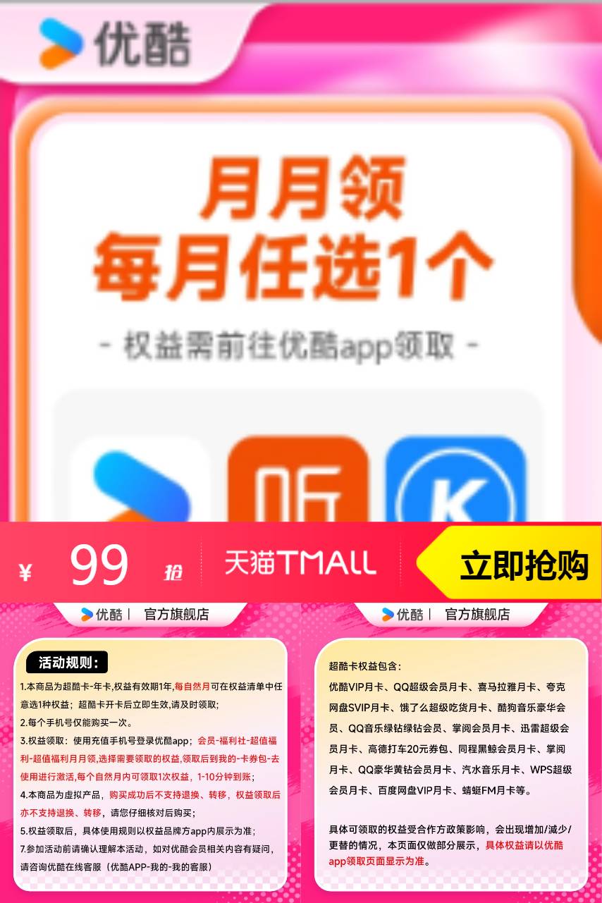 【商品券减100元,到手99元,折合单月8.25元】优酷QQ音乐喜马酷狗WPS等VIP年卡,无论是宅家追剧还是出差旅行,优酷的独家大剧、电影和综艺,都能让你随时沉浸在影音的海洋中。