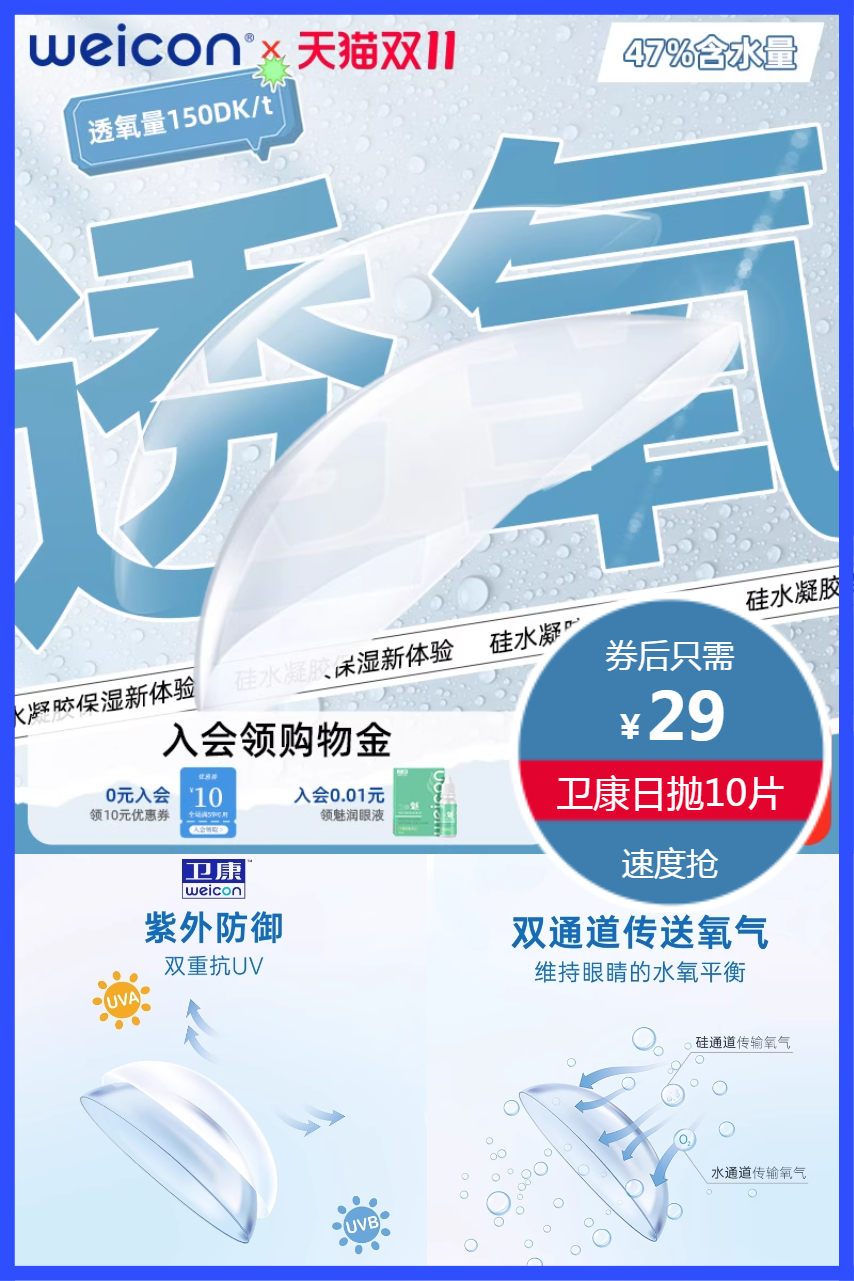 "88会员+淘金币+9折消费劵+劵到手22.93元!卫康硅水凝胶隐形眼镜日抛10片,第三代硅水凝胶材质,透氧量是水凝胶材质的近 8倍,双重保湿,轻薄透氧,中心厚度0.08mm新手易摘戴,紫外防御,双眸水润舒适不干涩"