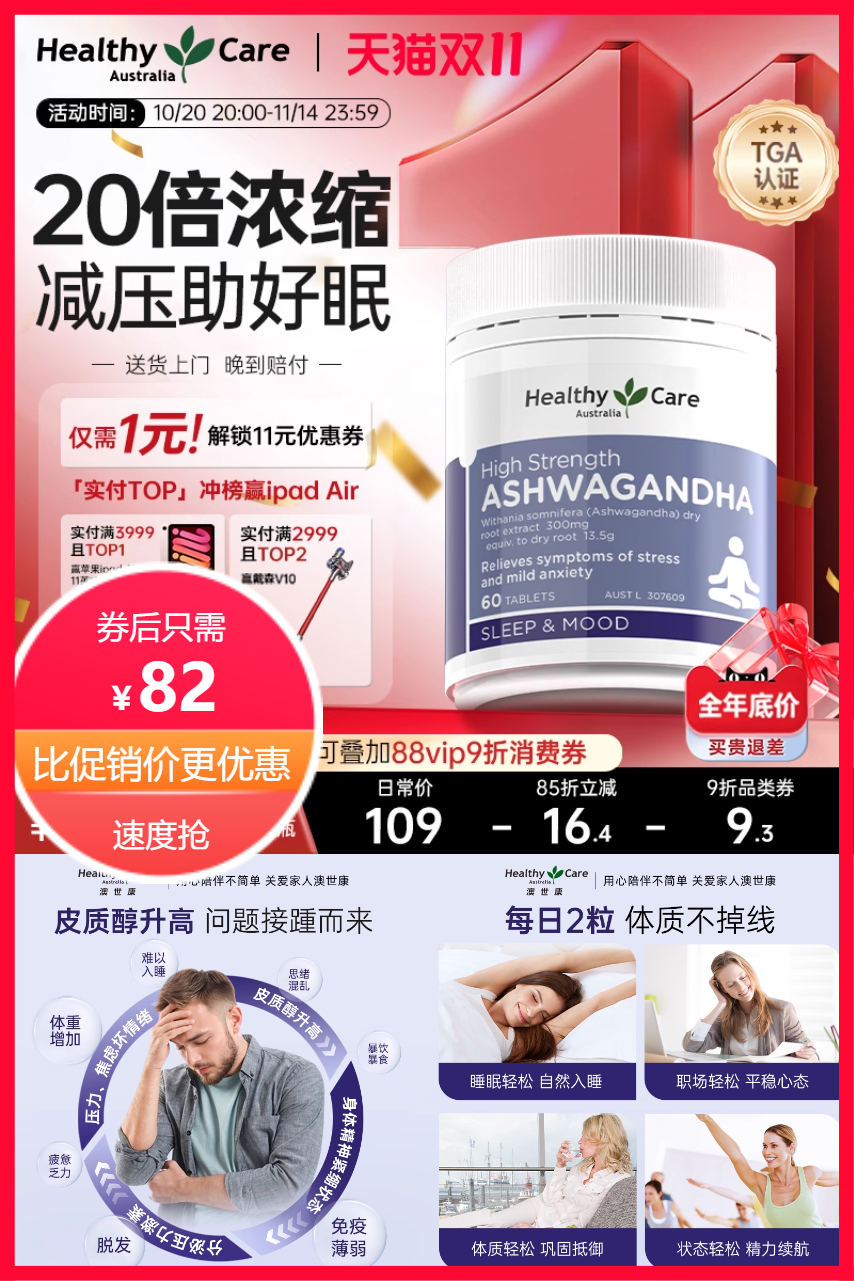 【凑国际惊喜券300-30+品类券200-20到手约66】HealthyCare澳产草本精粹,解压神器 + 提升脑力 + 助眠良品!!天然无添,安全可靠!多国认证,品质信赖!关键是全面呵护身心健康!!