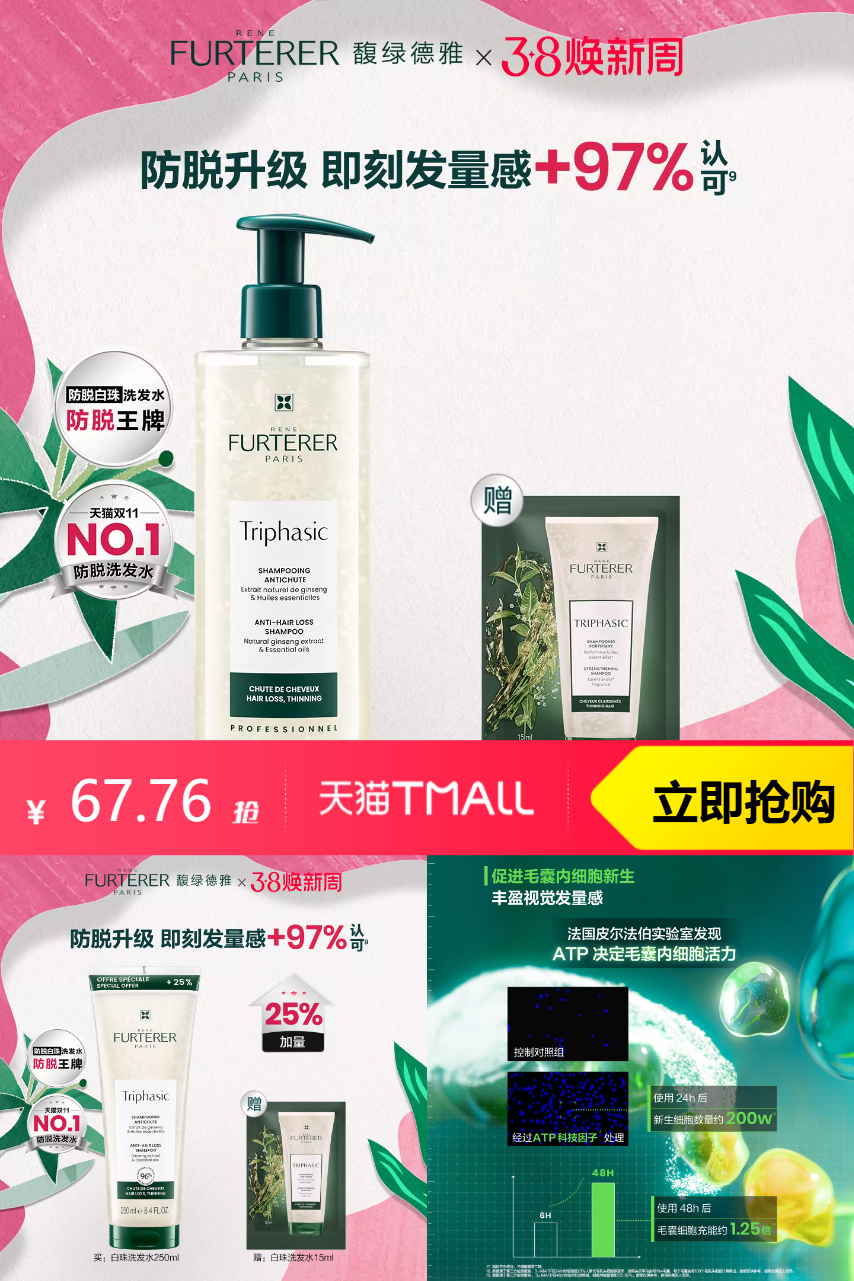 【官方立减49,淘金币抵扣12.42,满200减25消费券减9.52,到手价67.06】馥绿德雅防脱白珠洗发水250ml,全链路减少断落发修护丰盈一瓶到位!采用APG+氨基酸表活体系,接近头皮健康pH值,保护头皮酸碱平衡温和清洁不残留,洗感清爽不干涩!快来试试吧!