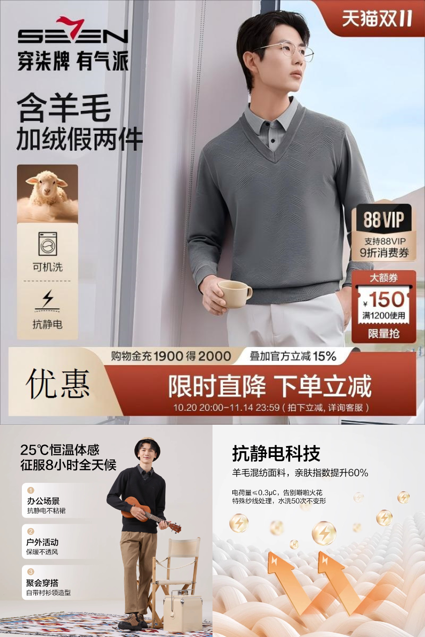 【新客省28元,88vip叠加消费券到手预估184】柒牌加绒假两件翻领毛衫,2025秋冬新款,羊毛针织保暖舒适,加绒设计锁温御寒,立体剪裁显瘦挺括,穿搭有型又有温暖,性价比高,送礼自穿都很好!