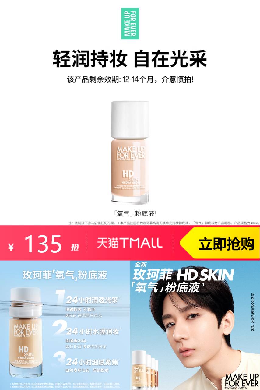 【效期还有一年到一年2个月,可叠加6元淘金币到手135】makeupforever玫珂菲全新氧气粉底液,清透持妆不暗沉,0粉感透现原生微光,24小时清透光采~