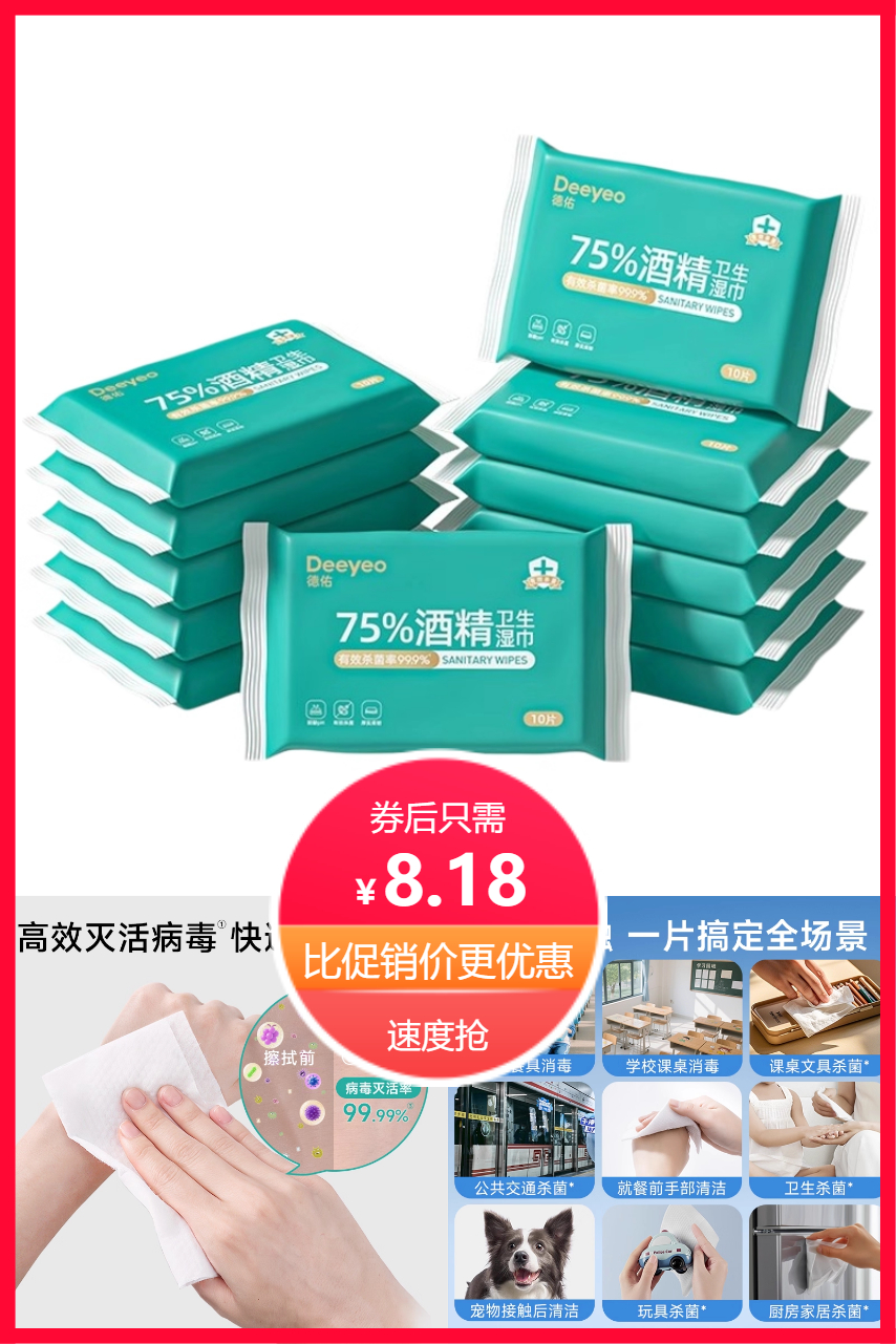德佑75度酒精消毒湿巾99.9%杀菌湿巾小包便携单独包装旅行大尺寸