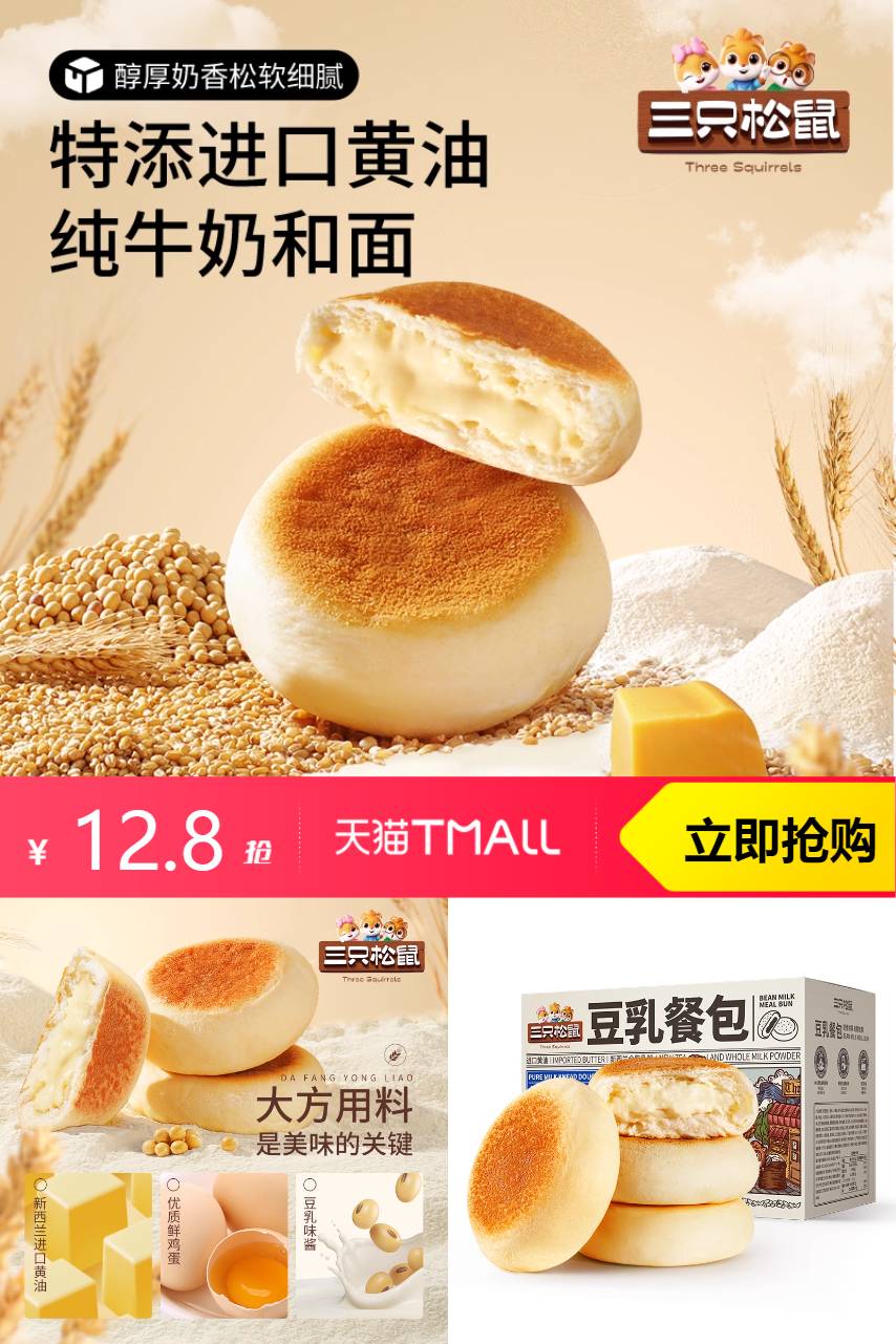 【翻倍,消费券和淘金币到手10.14】到手价10.51元!!!这款三只松鼠豆乳餐包它含有新西兰全脂乳粉和进口黄油,豆乳酱心,口感细腻丝滑,奶味浓厚,绵密松软,非常适合作为早午晚餐的百搭餐包。