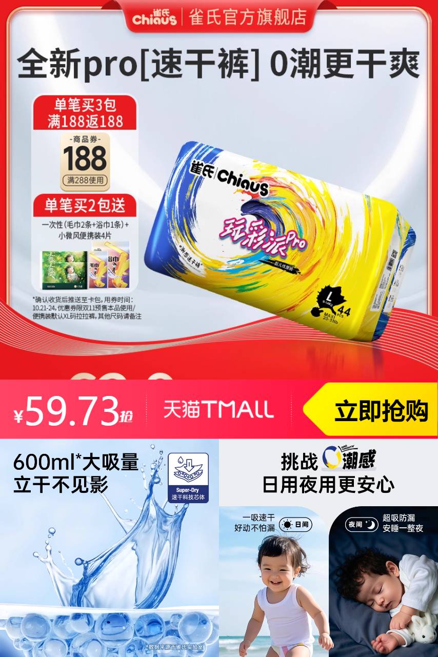 【官方立减18.18,满1件6.92折,限时礼金补贴3.87元+淘金币拉满5.3到手50.56,叠加9折消费券到手45.5】小芯肌大容量,屁屁干爽更自由!上万吸水粒子,锁水低反渗,吸收强劲干爽透气,轻柔亲肤,让宝宝轻松学步,买好的纸尿裤,不折腾小宝!库存见底,动作要快!