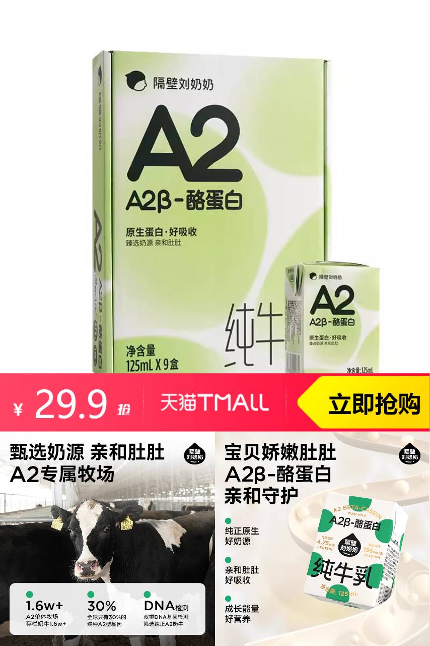 【原价44.9-立减7-商品券8-88vip1.5-淘金币抵扣1.34-淘礼金抵扣1.495=25.565】隔壁刘奶奶,A2mini儿童纯牛奶125ml高钙奶,配料表只有生牛乳营养很高!宝宝超爱喝的隔壁刘奶奶‼奶香浓郁,奶质甘甜,越喝越爱~