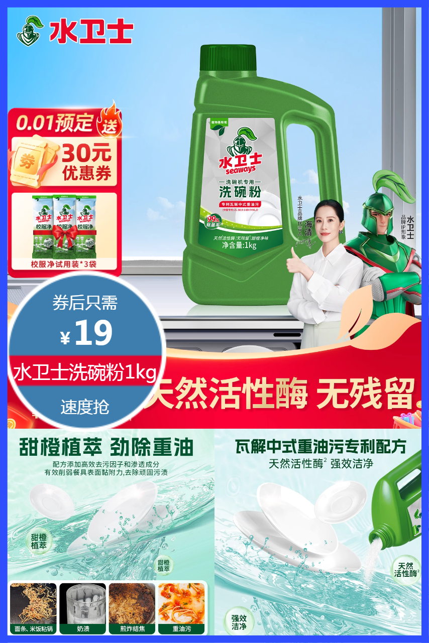 立减9元+限时补1.23元+淘金币+消费劵到手15.12元!水卫士洗碗机专用洗涤剂强效洗碗粉1kg,植物源力,劲除顽垢,天然活性酶,除菌率99.9,健康无残留,植兹甜橙精华,气味清新更净味!