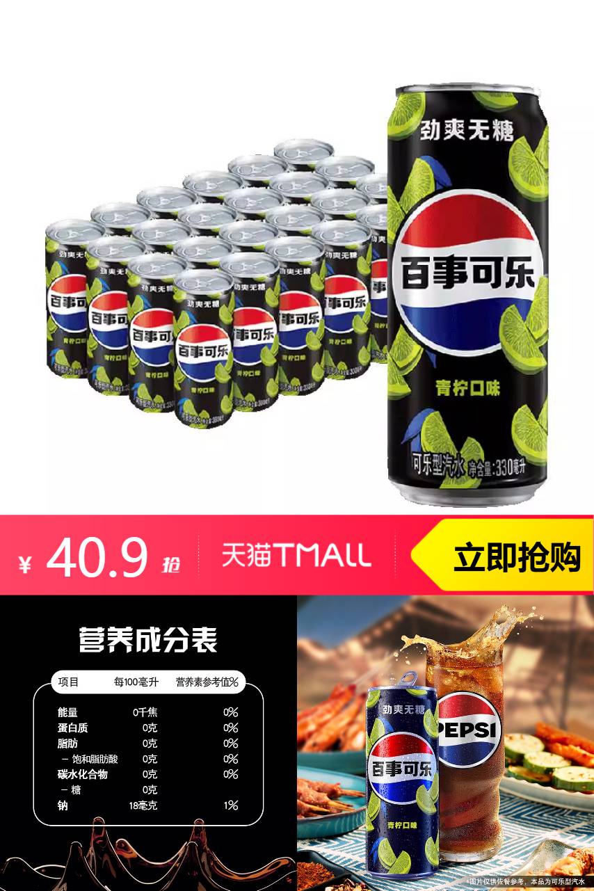 【88vip2.05,淘金币2.19,88VIP双11消费券3.67,猫超价到礼金1.63,到手31.36】百事可乐青柠味汽水细长罐330ml*24,百事焕新劲爽无限~