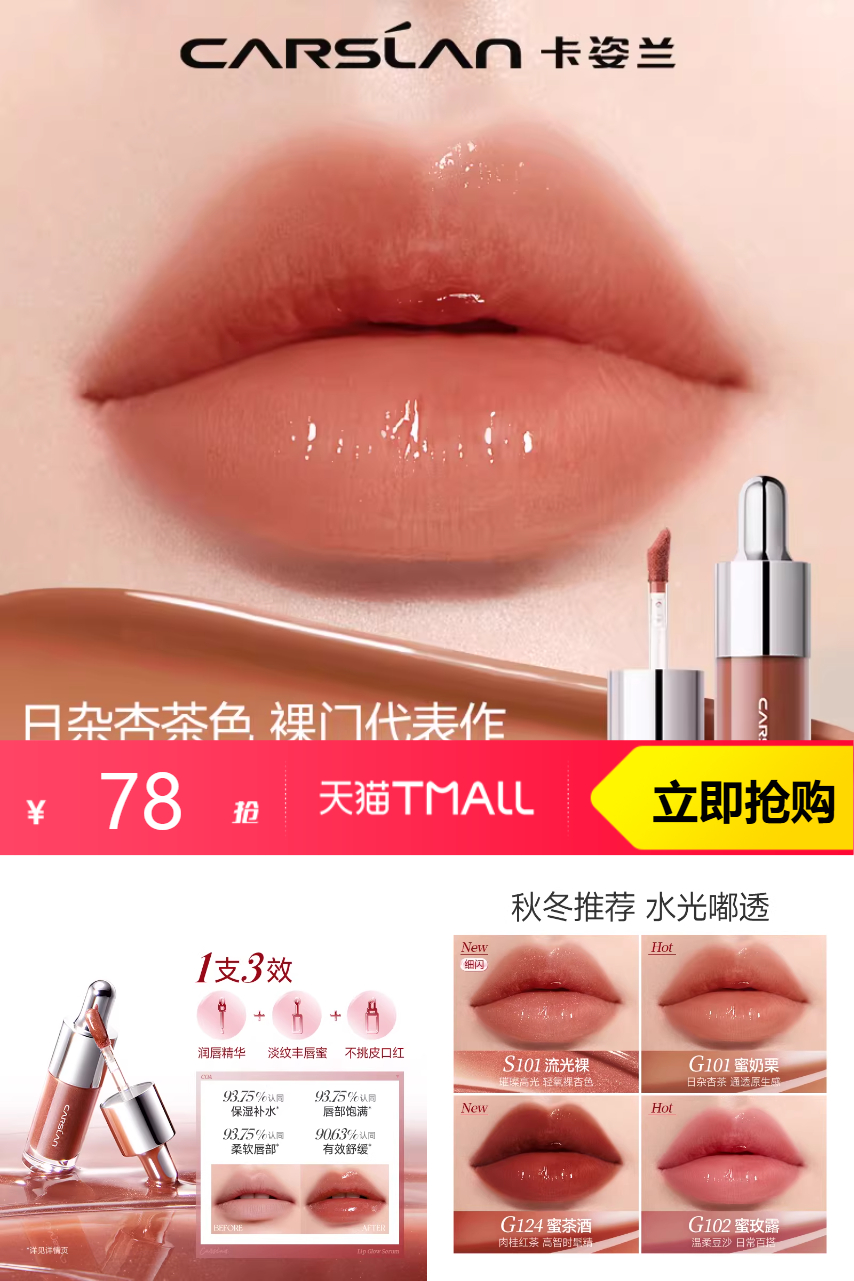 【膨胀15% ,有爆品闪购3.73,淘金币抵扣7.47,拍单支装用三支装凑单一起加购叠消费券200-25,会员券350-50,精致生活券200-15,最终到手仅需43元一支!!】卡姿兰唇部精华口红镜面水光滋润唇彩唇蜜,锁色不脱妆,轻盈透亮。唇部水润光泽,你的优雅秘籍。独特配方,持色不沾杯。好色必入,炫彩随行,宠爱双唇。