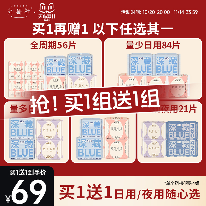【买1送1】她研社深藏Blue卫生巾姨妈巾奶滑小方干爽日用防漏夜用