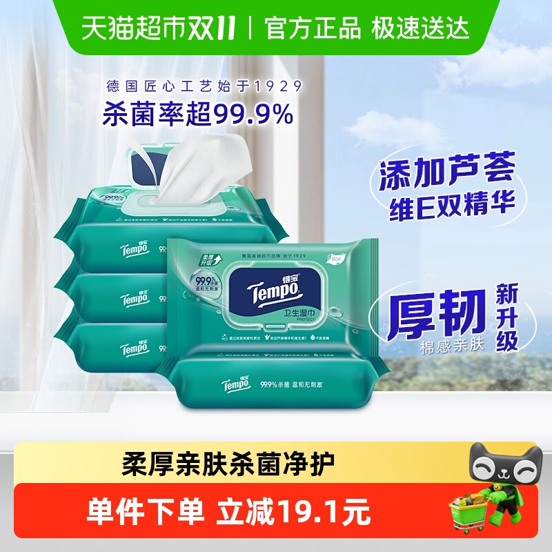 Tempo/得宝湿巾无酒精不粘腻温和加大加厚湿纸巾80片*5包