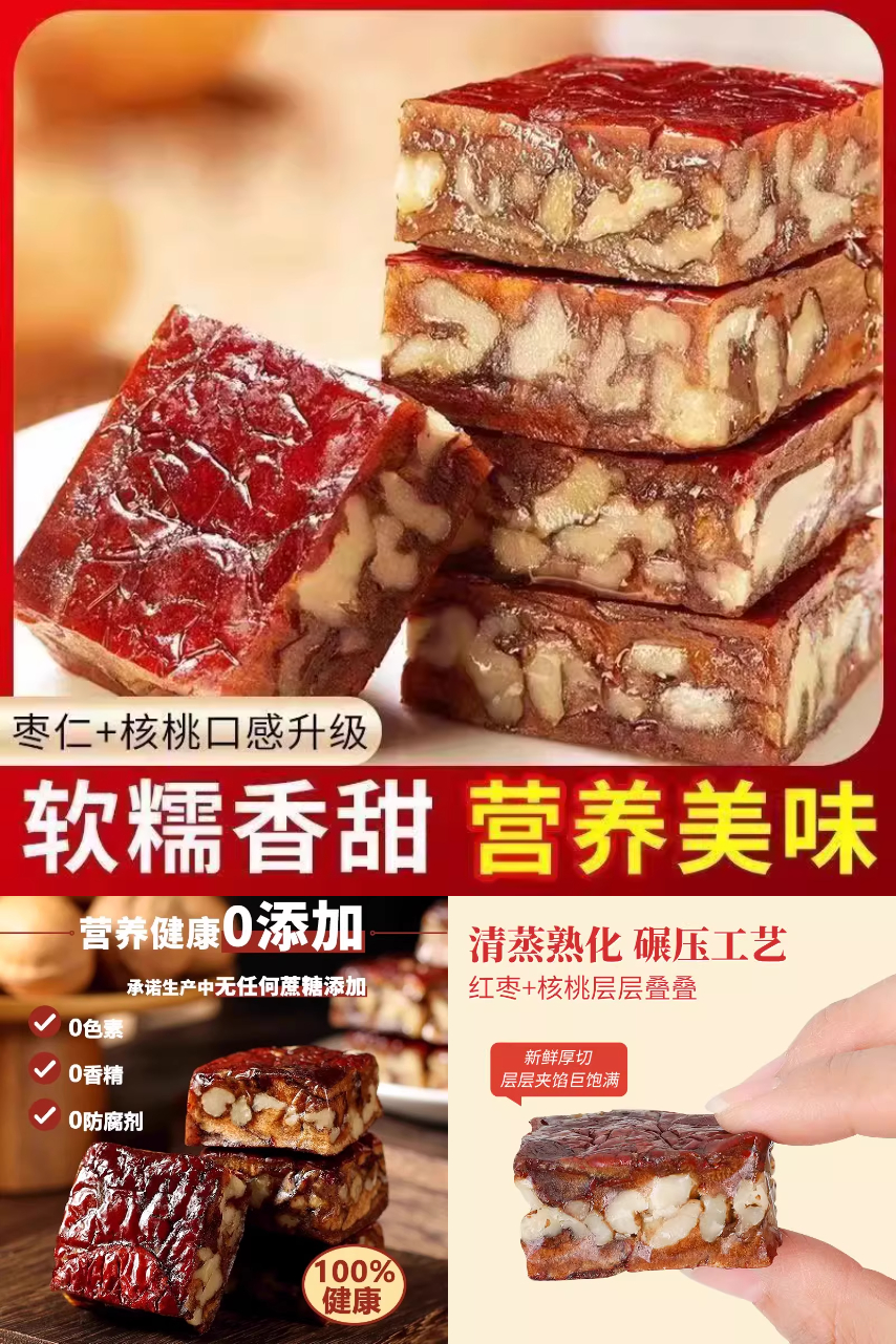 原味枣仁派,新疆红枣夹核桃仁,真空锁鲜包装,营养美味两不误~16.9元享地道轻山悦色零食,红枣香甜+核桃酥香,孕妇也能安心享用的健康小食!办公室抽屉常备款,随时补充能量好味道