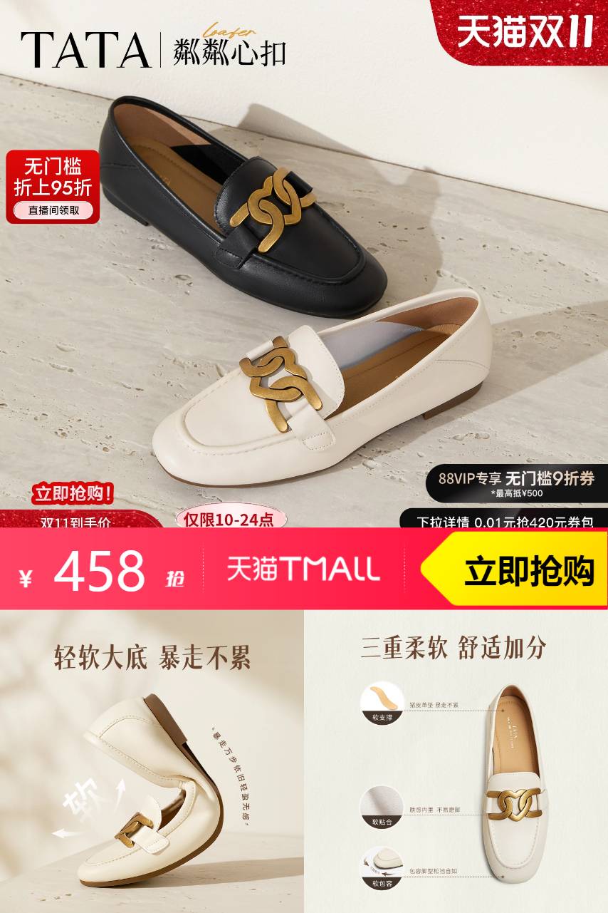 【无门槛9折券,官方立减15%省69元后到手305.08元】经典与舒适兼备,这款Tata他她通勤乐福鞋女平底单鞋,以英伦风为主打,彰显出优雅百搭的魅力。方头设计巧妙地提升脚部线条,使穿着更加挺拔有型,同时低跟高度让你在长时间穿着中也能享受舒适体验。细腻牛皮革鞋面,搭配猪皮革和织物面料的里料,提供了脚感舒适度。