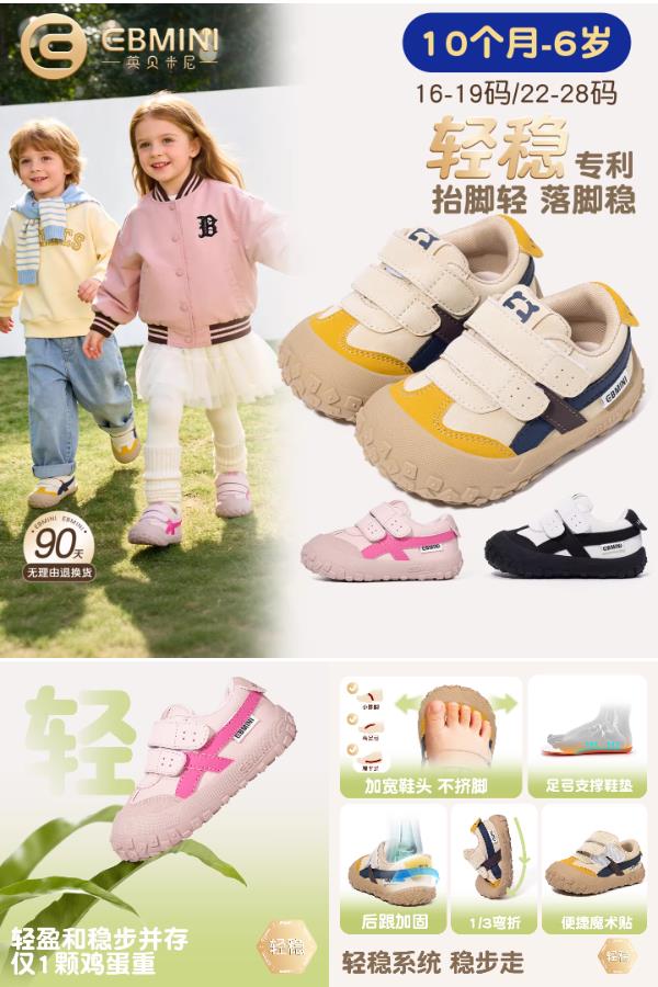 英贝米尼学步鞋专为0-3岁宝宝设计,超轻柔底+3D立体足弓支撑,累脚~159.9元入手国际母婴认证品牌!魔术贴开合便捷,透气网布+加宽前掌,舒适不挤脚更护足型~小脚丫的成长刚需,现在就安排!