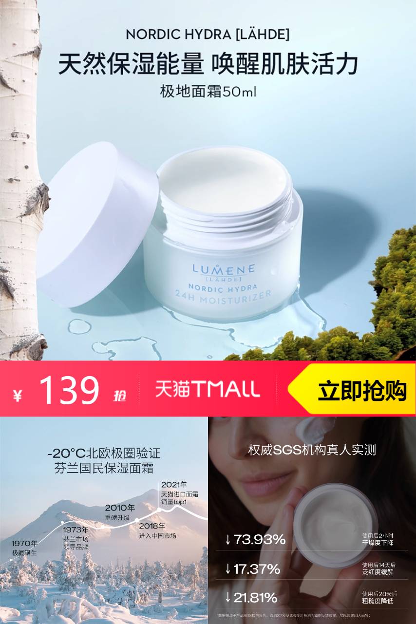 【优惠前288元-超级立减44元-105元券=139元,加赠20ml*2旅行装+2ml*5试用装,到手100ml】lumene优姿婷芬兰极地面霜,自然贴肤,0感润护24H 极地保湿”新方案。
