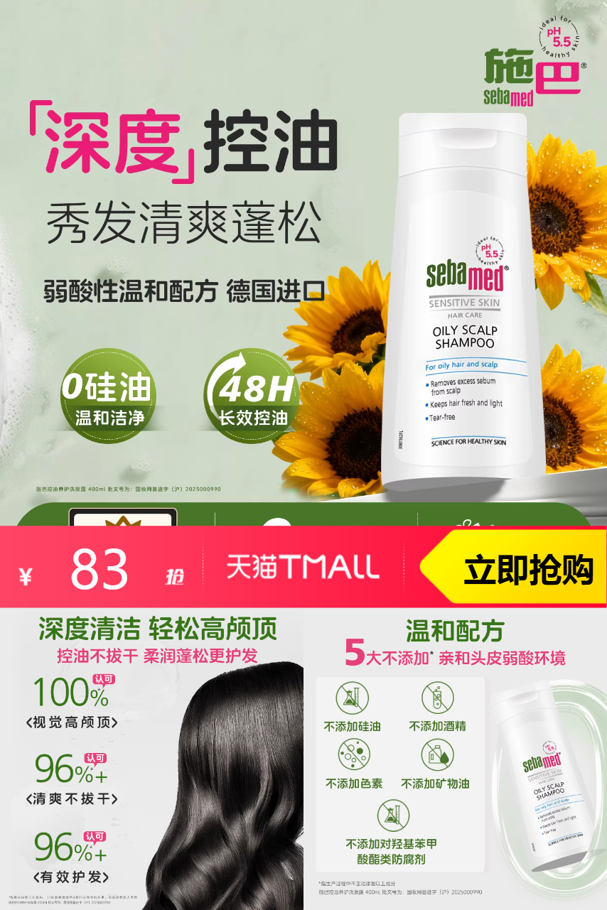 【店铺限时补贴4.21元+88VIP专享9.5折+叠加淘金币5.1元+凑200-25消费券+年货节超级红包+首单礼金5元=最终到手56元左右】sebamed施巴控油洗发露400ml,深度清洁 轻松高颅顶,控油不拔干, 柔润蓬松更护发~