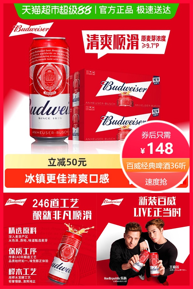 立减50元+券10元+点击右上角三个点进入淘金币省2.18元后约145.82元,单罐只需4元,百威经典醇正啤酒450ml*36听,9.7°P铝罐整箱,精选原料,榉木发酵,轻奢慢酿,口感醇正,细腻顺滑,新装百威,庆祝正当时,朋友聚会来一杯,还得选百威!