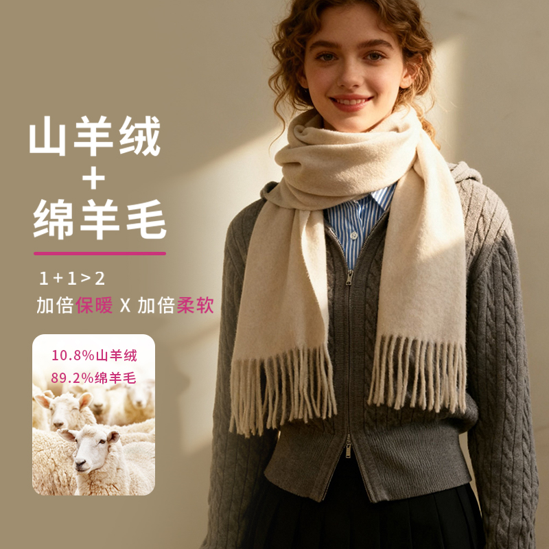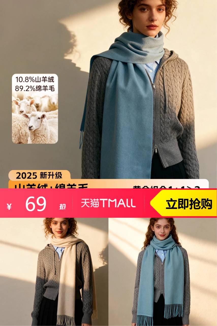 【淘金币抵扣1.5,到手价67.5】万物生羊绒羊毛围巾女2025新款冬季纯色,自天然牧场甄选每一缕纯净,以纯净原材织就每一寸柔软。