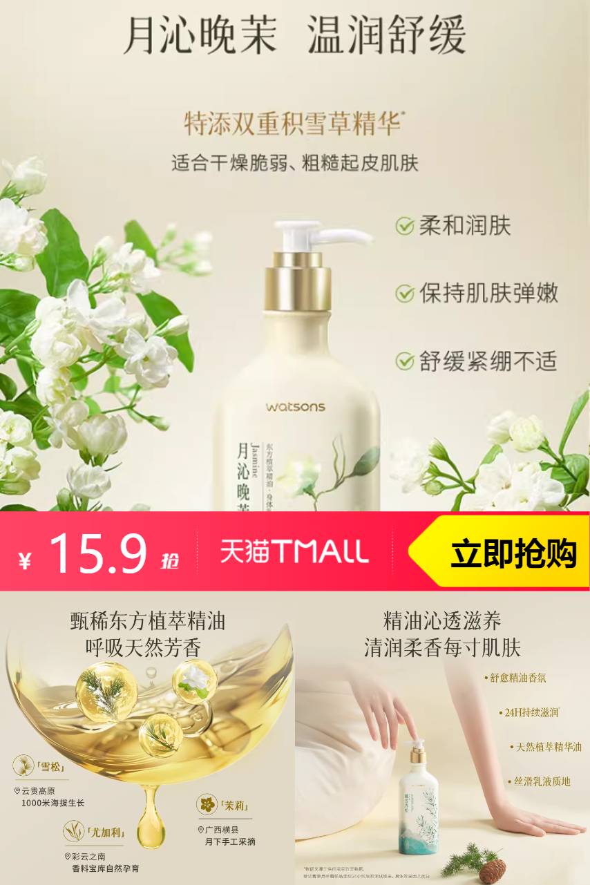 【淘金币抵10.6,礼金减0.63,88减0.8,到手13.87】屈臣氏植萃精油身体乳250ml,植萃精油能迅速被肌肤吸收,留下的是满满的滋润感。?它的味道是那种让人很放松的天然香气,仿佛置身在森林之中。
