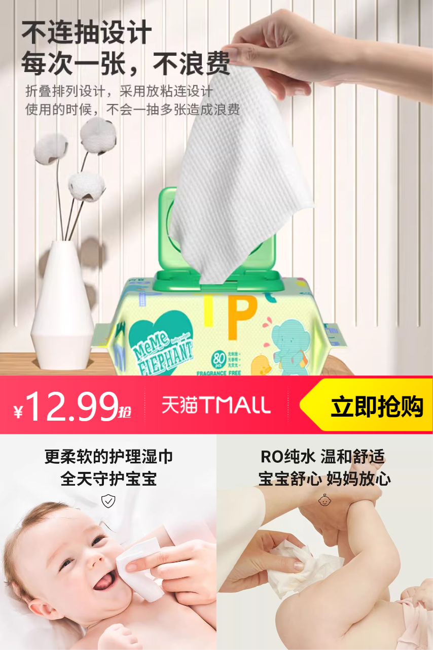 【原价19.99-优惠卷7=到手价12.99】婴儿专用湿巾纸80抽*5包,0甲醛、0荧光剂、0酒精!亲肤柔软细腻,不掉毛不连抽!更舒适更卫生!RO反渗透净水技术,食品级!宝宝放心添咬不易破!