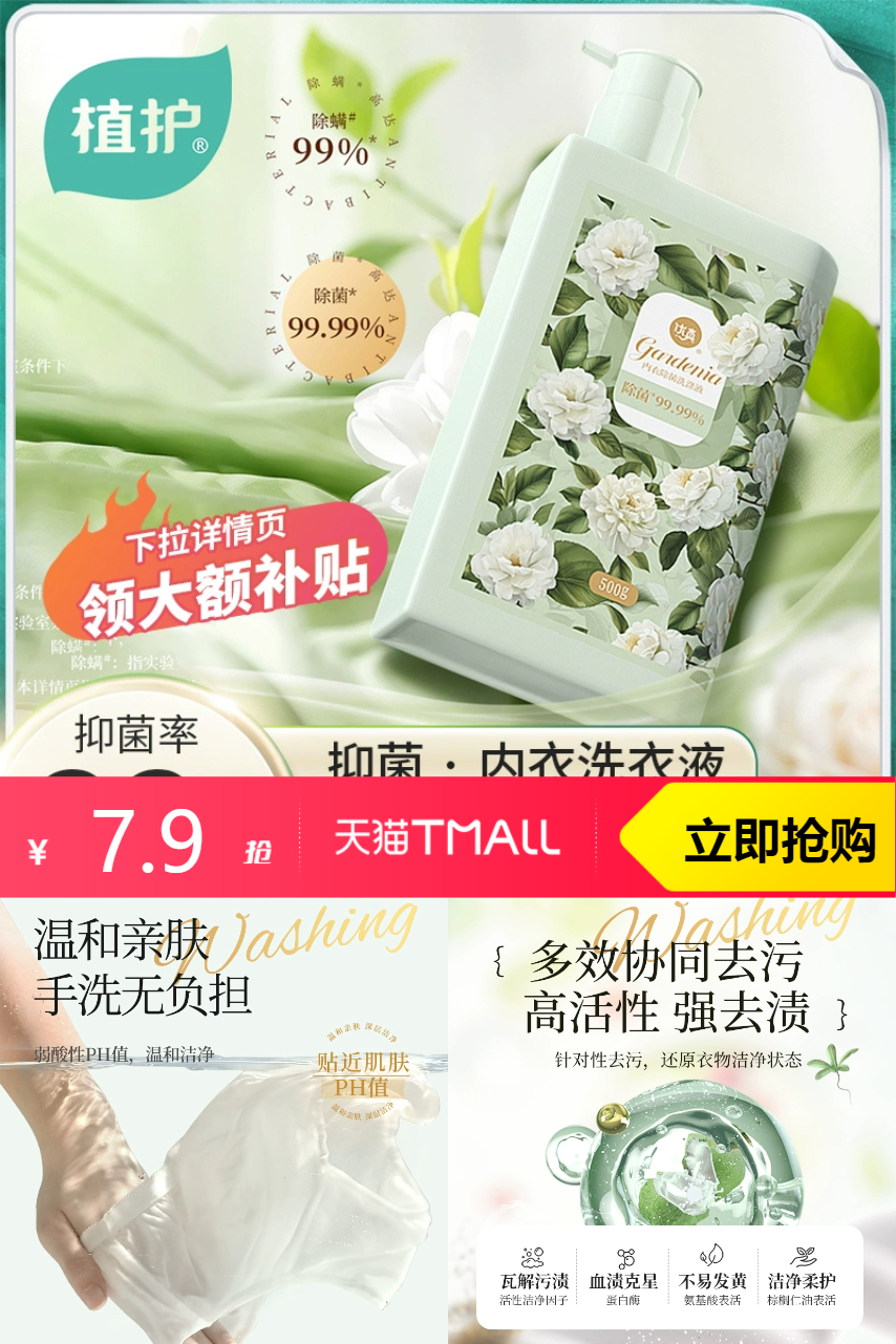 【天降7.9】植护山茶花内衣内裤洗衣液,除菌除螨抑菌洗涤女去黄去血渍。