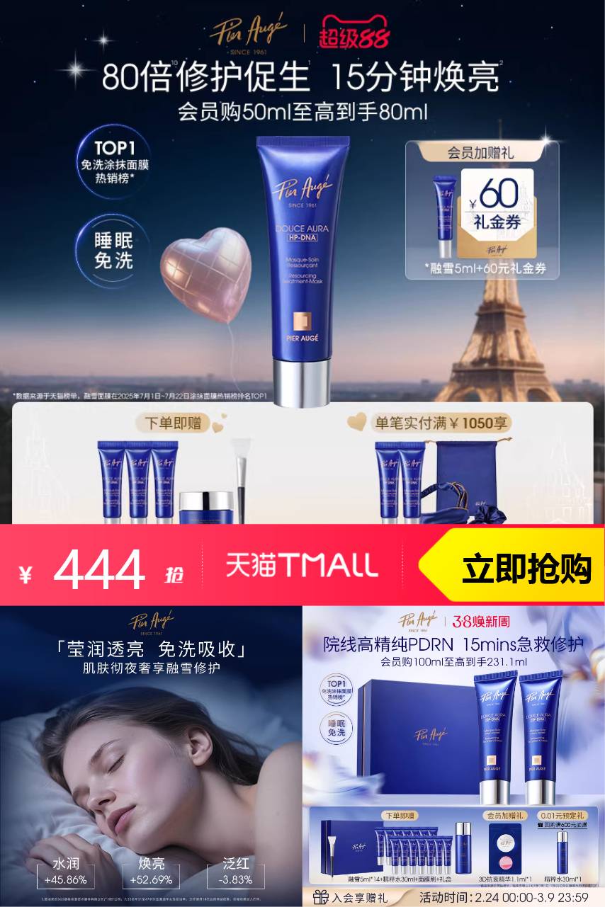 【原价541,官方立减65,领券减32,到手仅需444,88vip减22.95,限时红包减30,叠加消费券到手351.9左右,下单送15ml同款面膜,30ml纯粹水加面膜刷,会员加赠30ml纯粹水,yj膨胀到13左右】佩尔赫乔融雪面膜三文鱼精华睡眠免洗,褪红抗炎/均匀肤色/抗衰紧致~