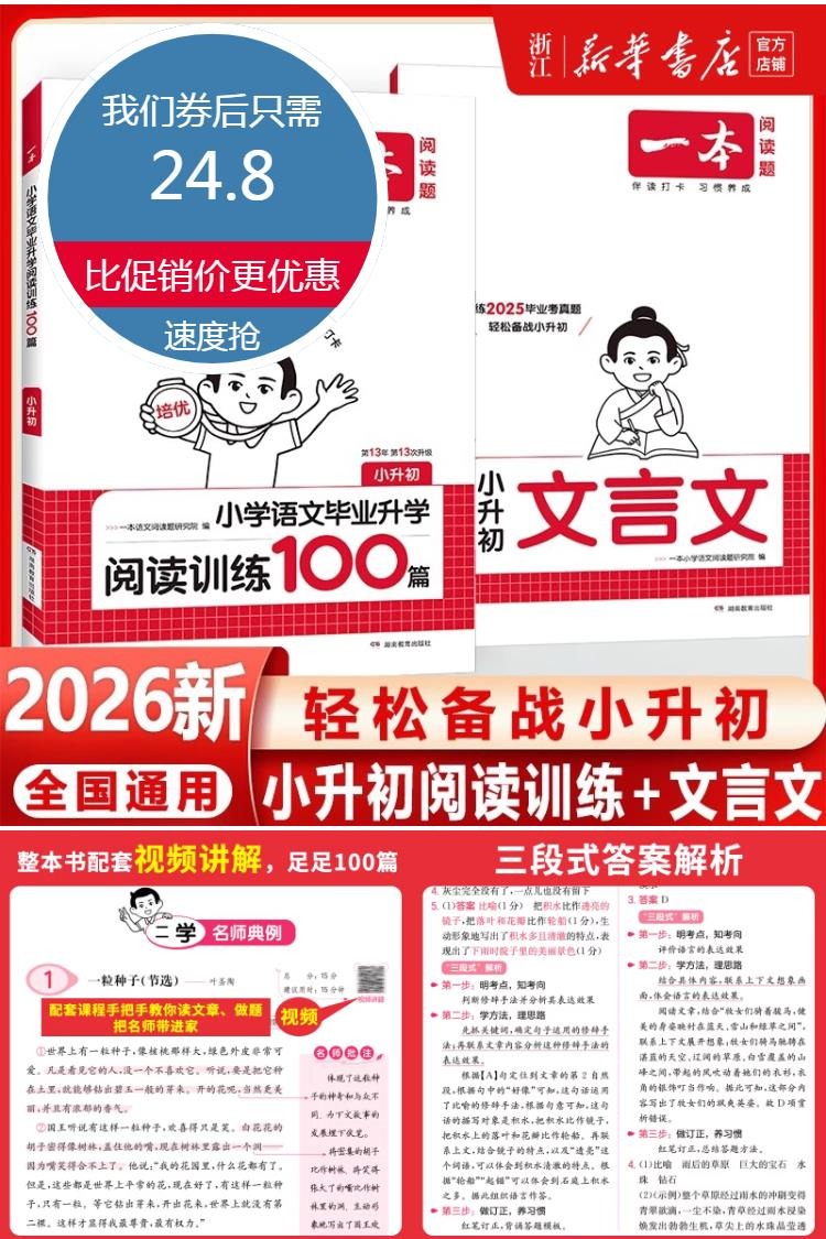 【赠视频讲解,新华书店正版】2026新一本小升初阅读理解100篇+小升初文言文,三段式答案解析,100篇新题,100节视频,100天打卡,培养孩子的阅读兴趣,提高孩子的阅读能力,轻松备战小升初!