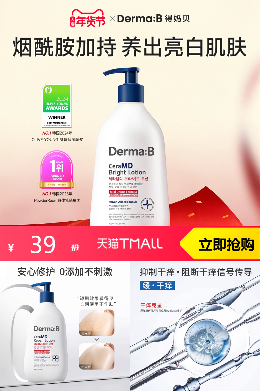 【79-立减10-券30-淘金币1.5=37.5元。凑消费券到手更低。】得妈贝亮白修护保湿身体乳400ml, 天然植物萃取,守护你的肌肤健康。这款身体乳蕴含天然植物精华,富含抗氧化剂和维生素,帮助修复因日常活动而造成的皮肤损伤。