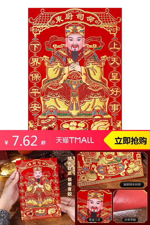【首单签到,立减1.18元】贺新春,过新年,恭请灶君入厨房。烫金工艺,自带背胶,加厚绒布材质,多款可以选择。厨房、餐厅、冰箱都可以贴。