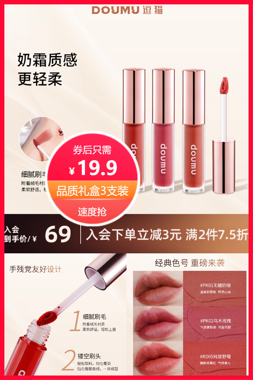 【DOUMU逗猫旗舰店3支装只需19.9元】奶霜质感更轻柔,细腻毛刷,镂空刷头,柔焦妆效,礼盒包装精致大气,旗舰店品质高~佣50%速抢!