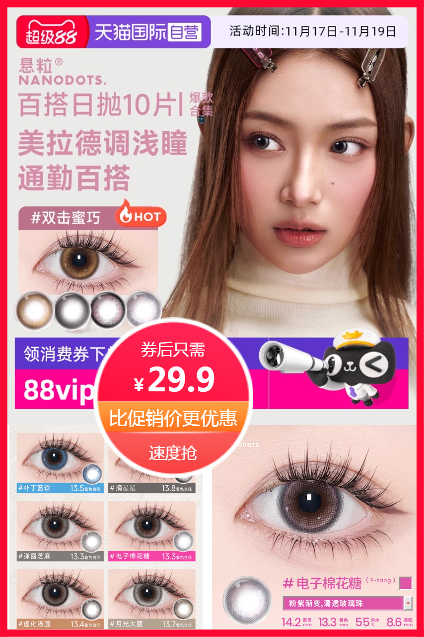 下详情页淘金币抵扣3.19元+88vip1.5元+购物金3元+立减25元,叠加优惠券到手约22元,NANODOTS自营悬粒美瞳日抛10片装,主打碳水材质带来的清透舒适。上眼轻薄无压,透气不闷眼,久戴也不易干涩滑片。自然融瞳花色不突兀,悄悄放大双眼,素颜淡妆都适配。日抛设计免护理,干净卫生还省心,自营品质有保障,日常通勤、约会轻松拿捏精致感~