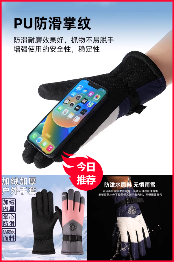 "PU防滑掌纹,防滑耐磨效果好,抓物不易脱手增强使用的安全性,稳定性。抵御风雪,高密度防风面料, 强力锁温,加厚喷胶棉,快速升温,加密厚绒,升级抗寒力。防泼水面料 无惧雨雪。"