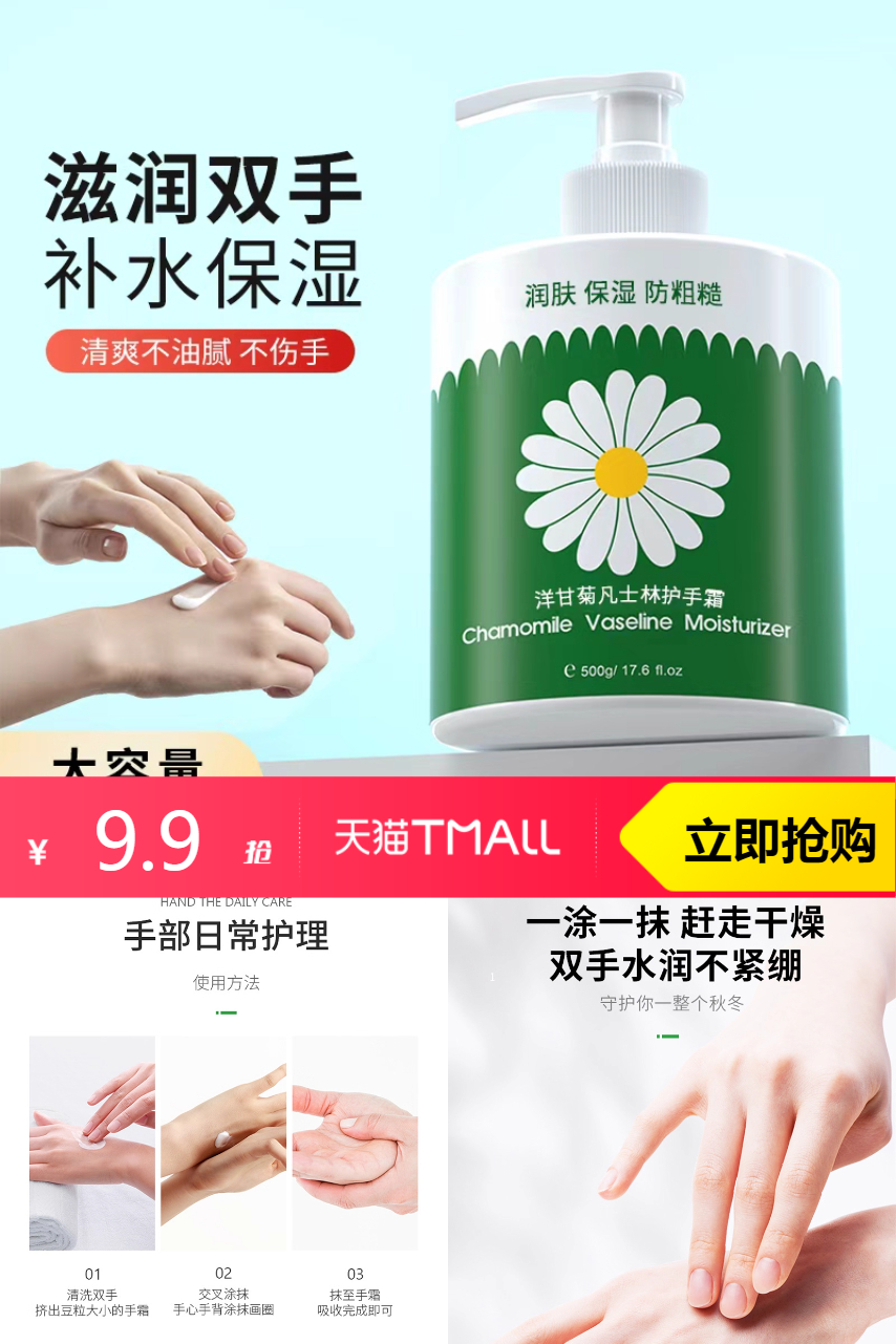 护手霜富含洋甘菊精华和凡士林成分,能深度滋养肌肤,锁住水分,让你的双手保持湿润、柔软。它不仅能防止手部肌肤干燥,还能舒缓肌肤不适,使你的手部肌肤焕发自然光彩。