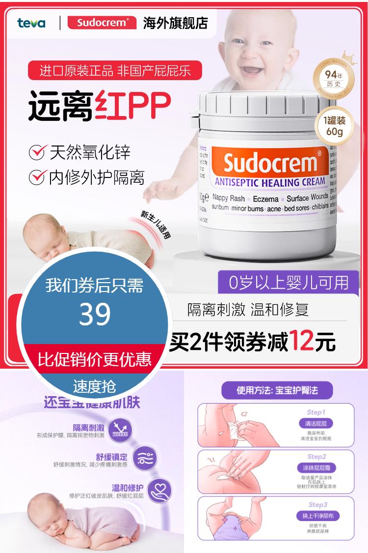 【125g大容量,叠加淘金币到手仅需36】宝宝红屁屁克星来了!英国Sudocrem护臀膏,含氧化锌屏障技术,温和隔离尿渍刺激。每次换尿布薄涂一层,形成透气保护膜,预防红屁屁超省心!宝妈圈口碑首选~