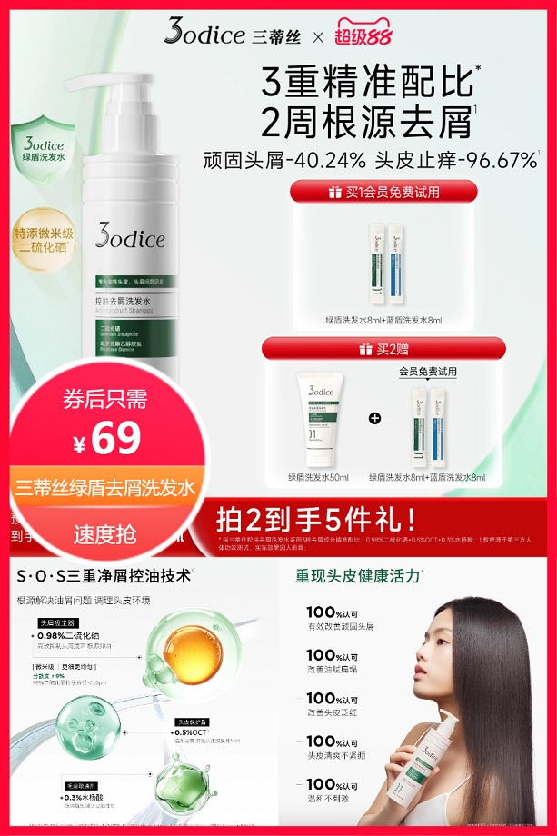 超级立减20元+券10元+点击右上角三个点进入淘金币省7.45元+首单4元后约57.55元,会员免费试用绿盾洗发水8ml+蓝盾洗发水8ml,三蒂丝绿盾洗发水,根源改善油屑痒,重塑头皮健康活力,微米级,更细更均匀!