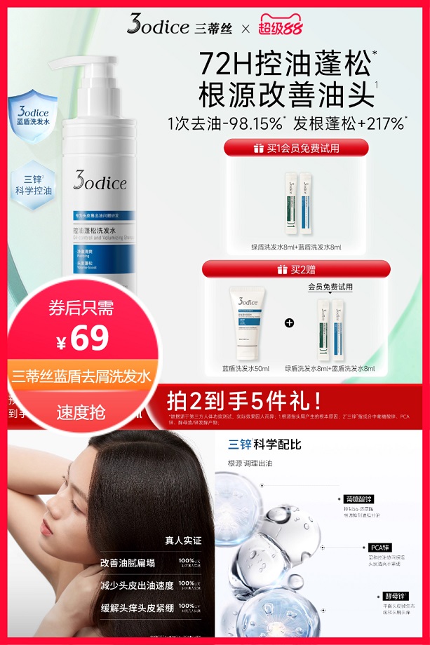 官方立减20元+券10元+点击右上角三个点进入淘金币省10.89元+首单4元后约54.11元,会员免费试用绿盾洗发水8ml+蓝盾洗发水8ml,三锌科学配比,根源改善油头,72H控油蓬松,还您头发清爽!